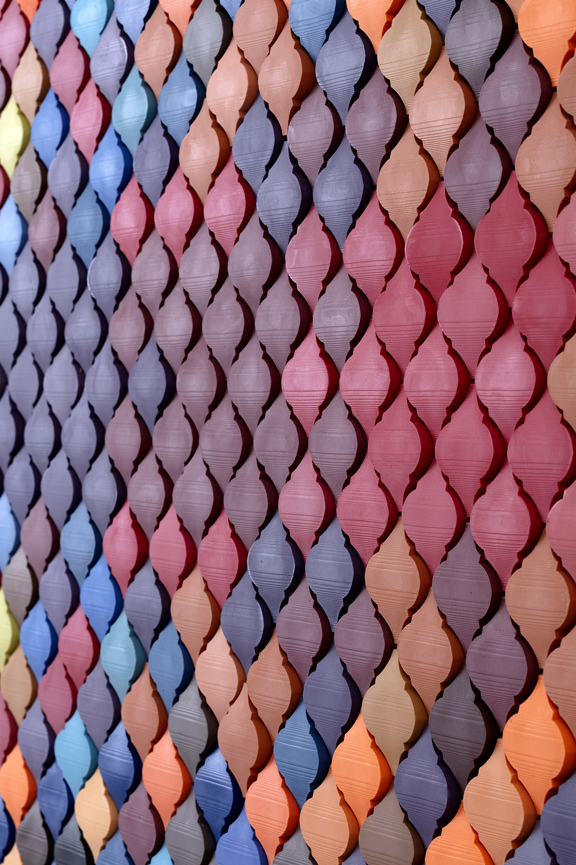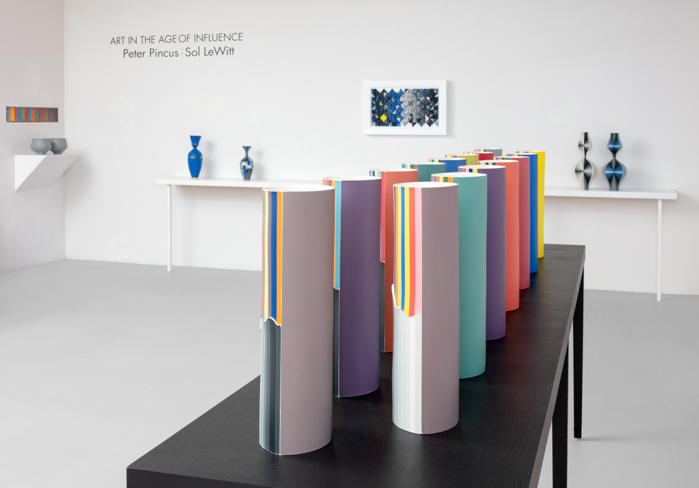 Using color theory and formulaic design patterns as points of departure, Pincus creates brightly colored vessels and expansive tile murals. Inspired by Sol LeWittâs distinctive style, this body of work takes on his influence in their vibrant patterns and forms. LeWittâs Wall Drawing #422 specifically relates to Pincusâ exhibition centerpiece, a series of 15 large-scale columns that carry colors across the surface of each form which create a large-scale painting when aligned together.