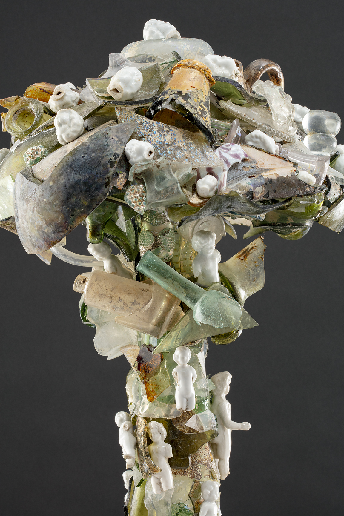De Vries’s glass cloud is an assemblage of shards of glass from recognizable broken objects, forming a 21-inch-high mushroom cloud. Kayser uses glaze “blisters” on black cow figurines and Scott repurposes a 19th-century platter with the addition of a photo collage of Houston that memorializes Hurricane Harvey’s rising waters. Alexander, Lee, Lipman, and Marin work with processes that exploit melting, etching, breakage, and erasing to produce metaphoric imagery that is often a harbinger of doom. The artists reference forms and history associated with familiar domestic objects such as plates and figurines, along with pottery shards, to reveal something new, carrying a foreboding warning.