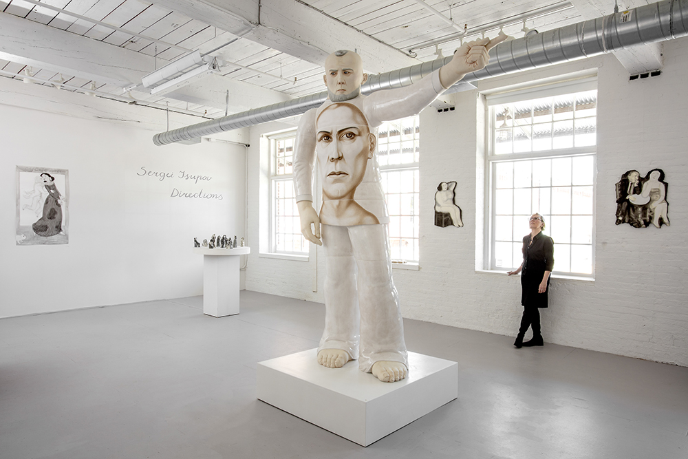 First to be presented is work by Sergei Isupov, whose sculpture titled Directions, inspired the series. A larger-than-life, authoritarian figure, the sculpture points towards a group of the artist’s smaller porcelain works which explore a range of ideas leading in new directions. Isupov, an established sculptor based in Cummington, MA, and Tallinn, Estonia, is world known for his surrealistic, figure-ground personal narratives which simultaneously integrate painted imagery and dimensional surfaces.