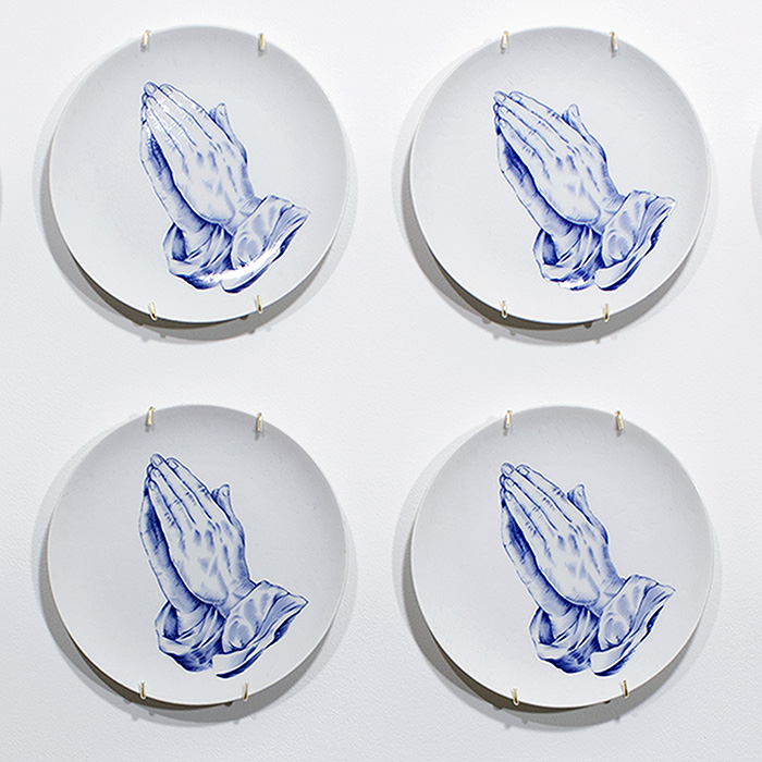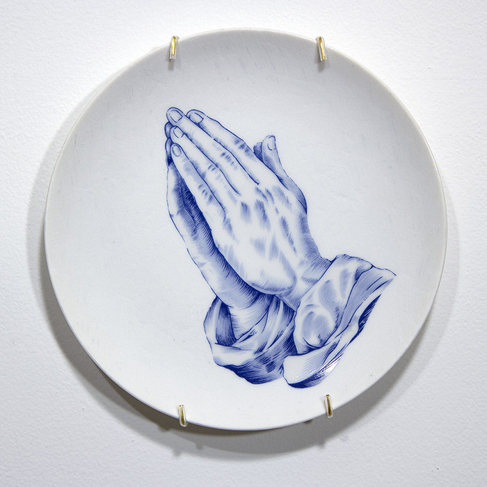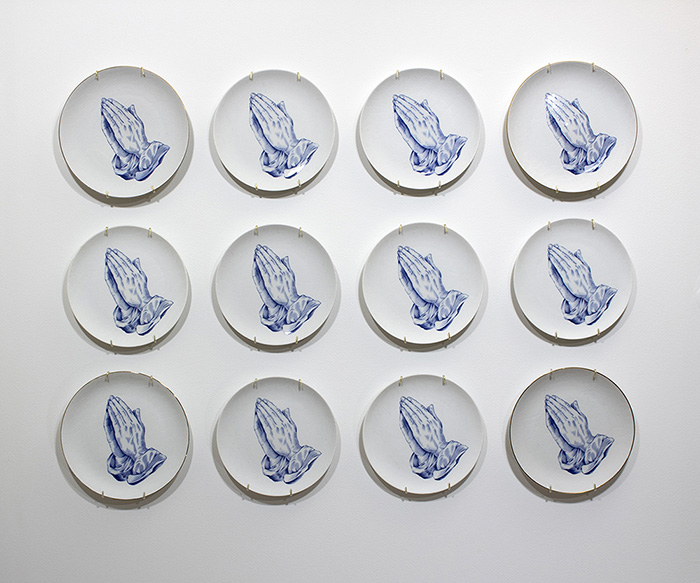 (pictured left) Hollie Lyko, “Gun Control (No One’s Listening)”, 2019, dremel-erased vintage praying hands plates, circa 1976, 28 x 30 x 1″. Installation View in Shaping Memories, Virginia MOCA, 2022.