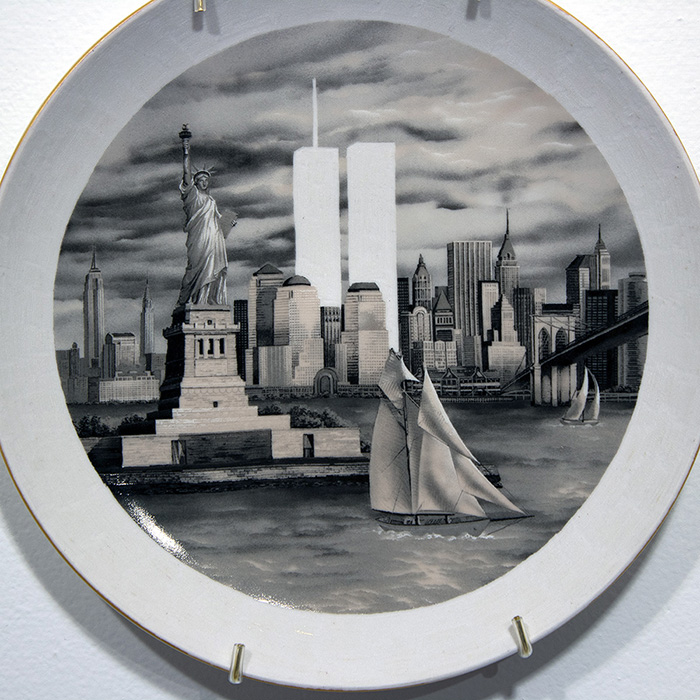 Within my latest series, I utilize Royal Copenhagen’s Statue of Liberty collector’s plates, vintage Catholic praying hands plates and New York City souvenir plates to re-make “American” images. I think about particular symbols of America and the values they represent while comparing them to events in our recent collective conscience. In this new work, I have begun evaluating the markers of my own generation – that of Millennials, beginning with the Columbine High School Massacre, the September 11th terrorist attacks and the Trump Administration’s U.S/Mexico immigration and border policies. This body of works draws from both Judith Butler’s text Precarious Life and from the kitsch objects themselves. Within material culture, and specifically ceramic collectibles, I find sentimentality, nostalgia, beauty, comfort and pride. By removing part of the plate’s image with a Dremel tool, I instill violence onto the object itself, re-making American images to reflect our pain, loss and desperation.