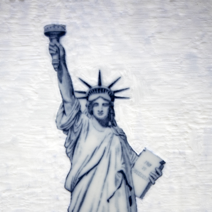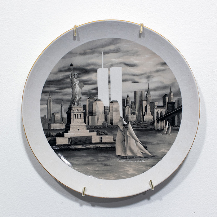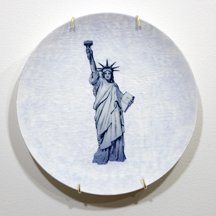 Within my latest series, I utilize Royal Copenhagen’s Statue of Liberty collector’s plates, vintage Catholic praying hands plates and New York City souvenir plates to re-make “American” images. I think about particular symbols of America and the values they represent while comparing them to events in our recent collective conscience. In this new work, I have begun evaluating the markers of my own generation – that of Millennials, beginning with the Columbine High School Massacre, the September 11th terrorist attacks and the Trump Administration’s U.S/Mexico immigration and border policies. This body of works draws from both Judith Butler’s text Precarious Life and from the kitsch objects themselves. Within material culture, and specifically ceramic collectibles, I find sentimentality, nostalgia, beauty, comfort and pride. By removing part of the plate’s image with a dremel tool, I instill violence onto the object itself, re-making American images to reflect our pain, loss and desperation.