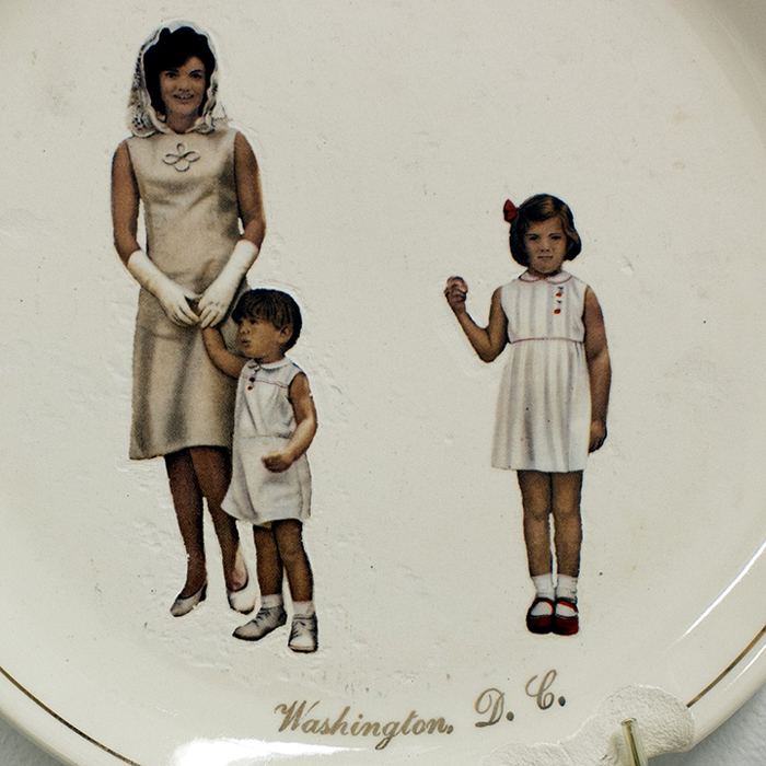 (pictured left) Hollie Lyko, “JFK no. 3”, 2018, dremel-erased JFK & Family collectible plate, circa 1961-1963, 7.25 x 7.25 x 0.5”.