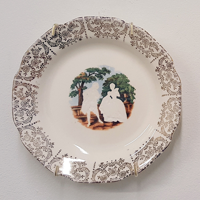 (pictured left) Hollie Lyko, “Lady & Gentleman no. 34″, 2018-2019, dremel-erased plate, circa 1950, 9.25 x 11.5 x 1”