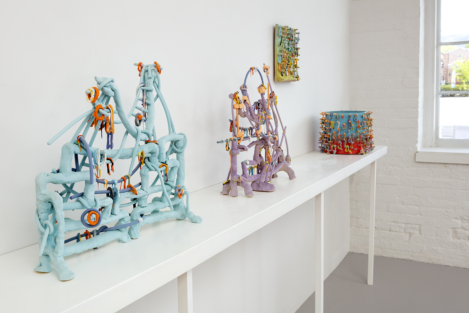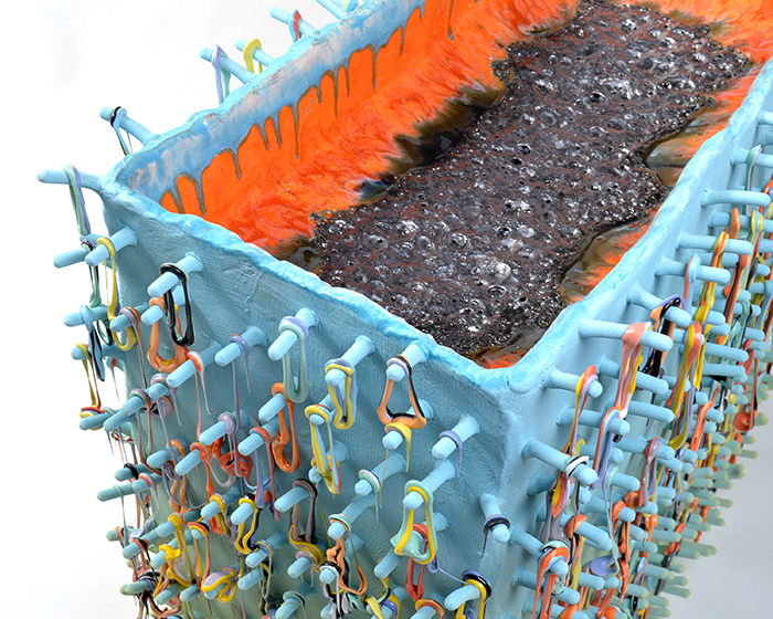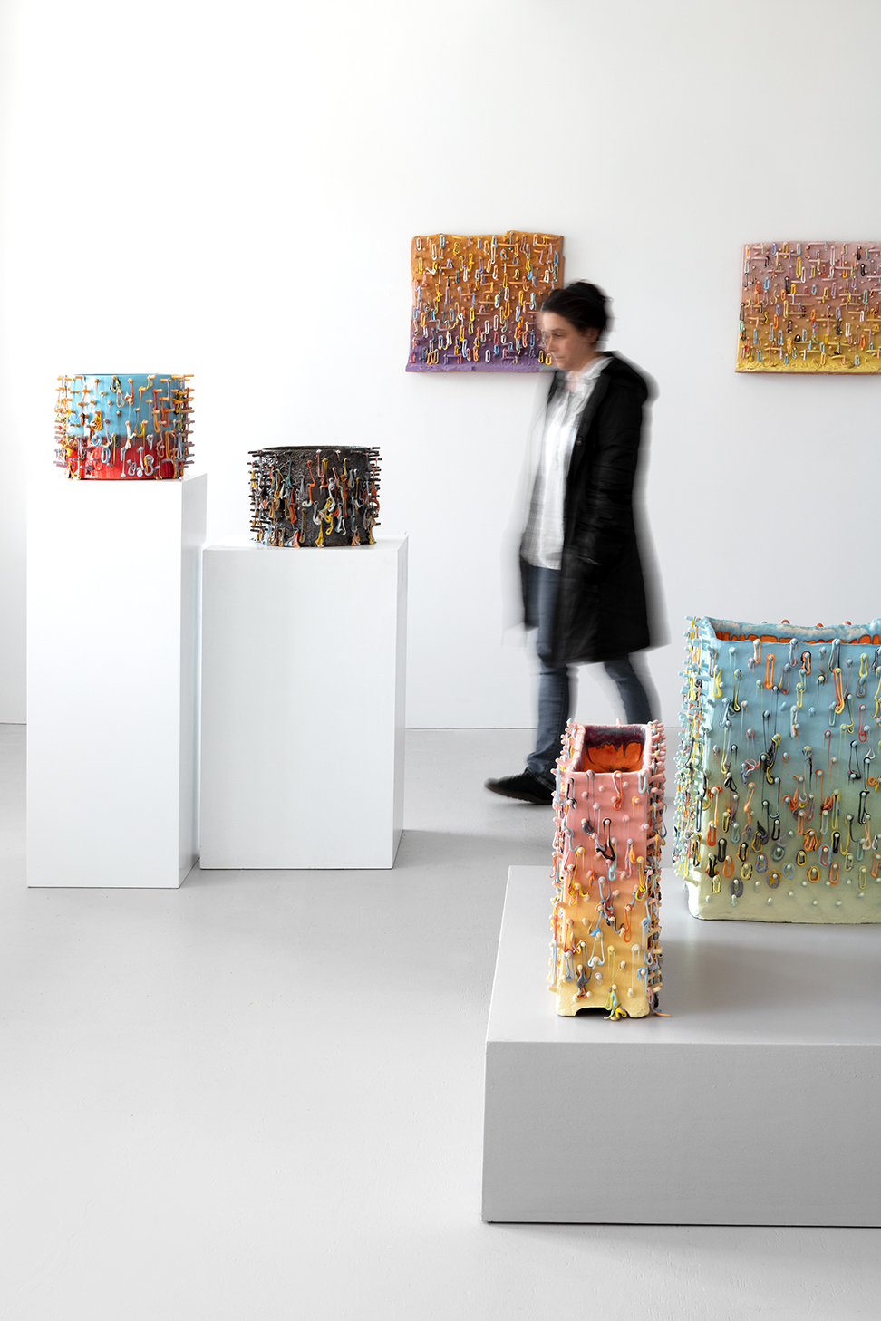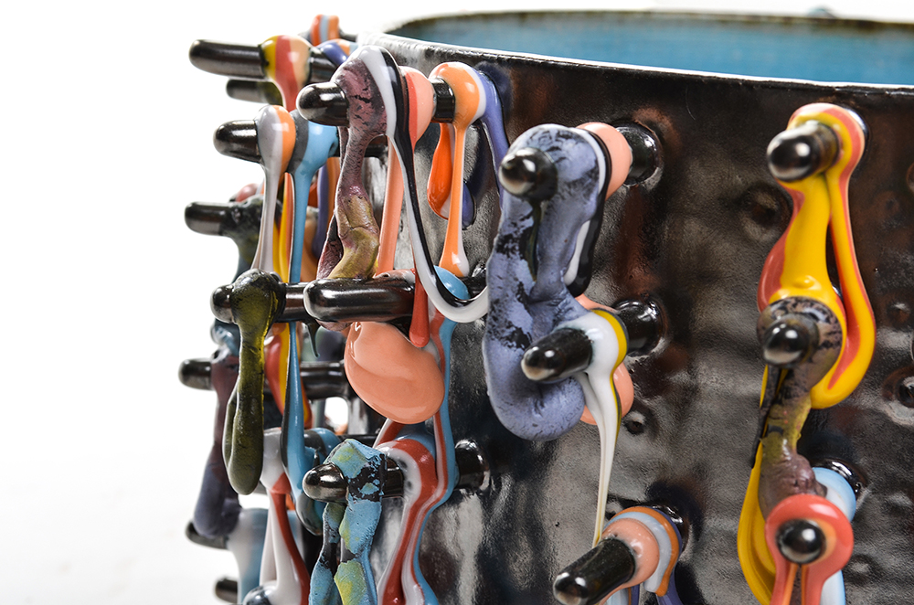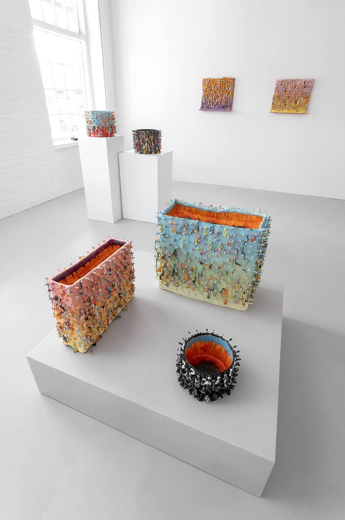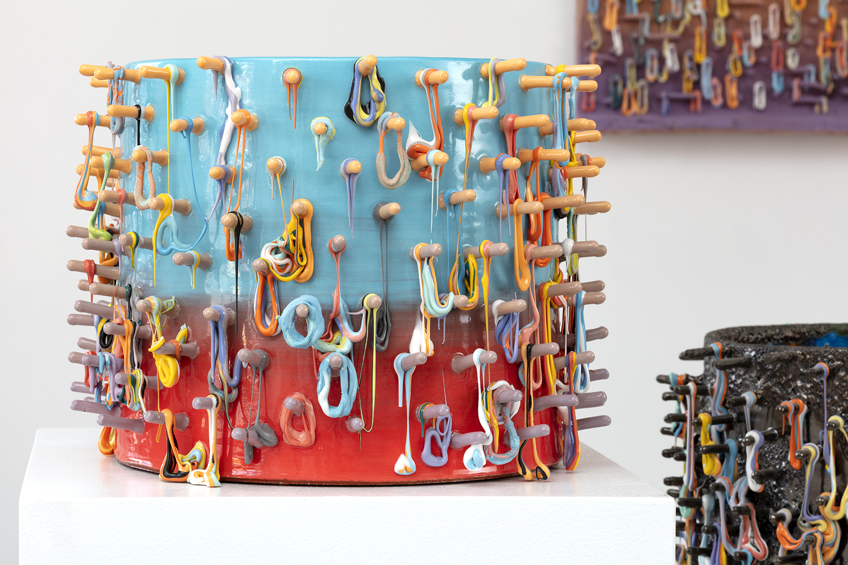 Mabry will introduce a new series of ‘dimensional paintings’ that use color, form and an exuberant sense of play to explore transformative nature of clay. Drips, spills and dollops of brightly colored glaze move across her forms, with a precise sense of chaos. The titled, Fused, alludes to the melted surface created within the kiln. This magical moment is something that Mabry is able to hold to within her glaze work, as if she’s able to slow down time itself.