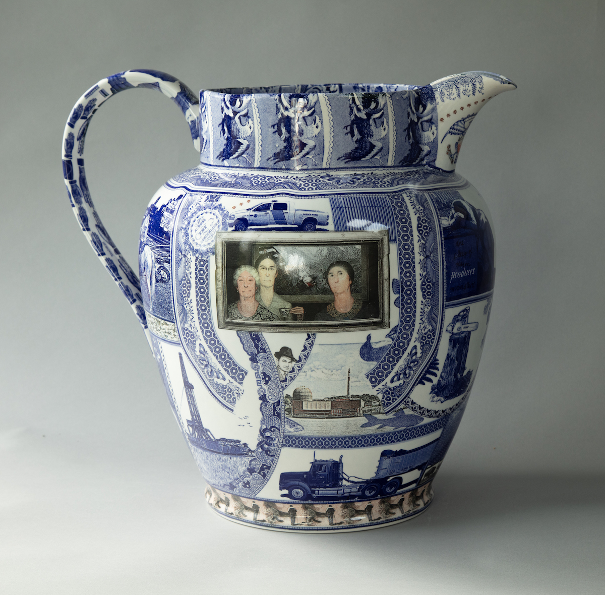2020, transferware collage on pearlware jug, 15 x 14 x 11.75″
