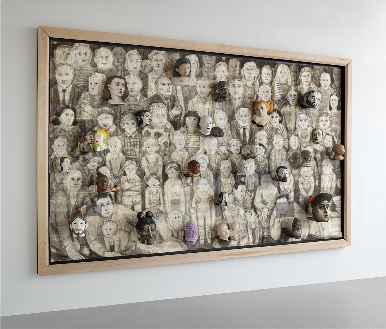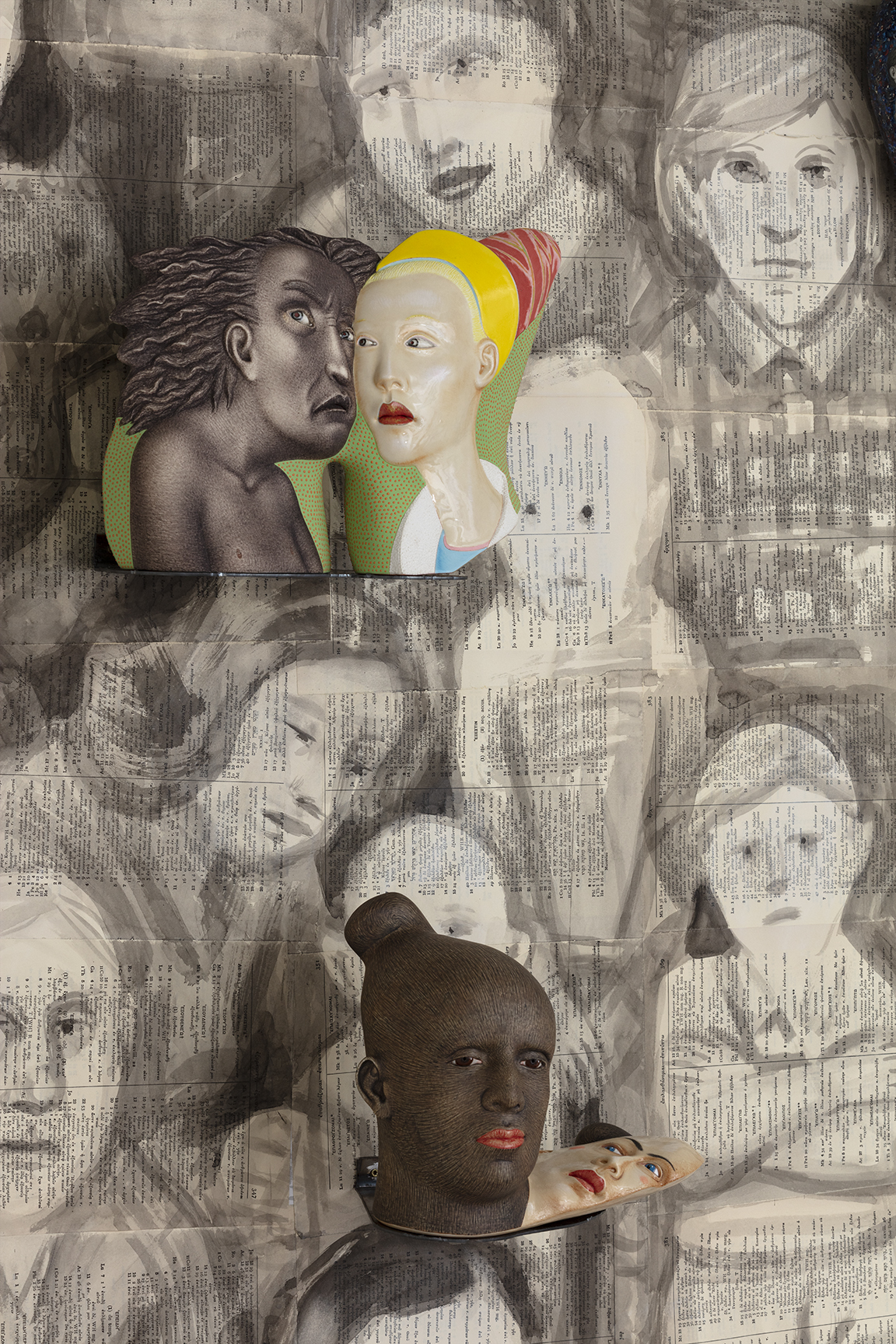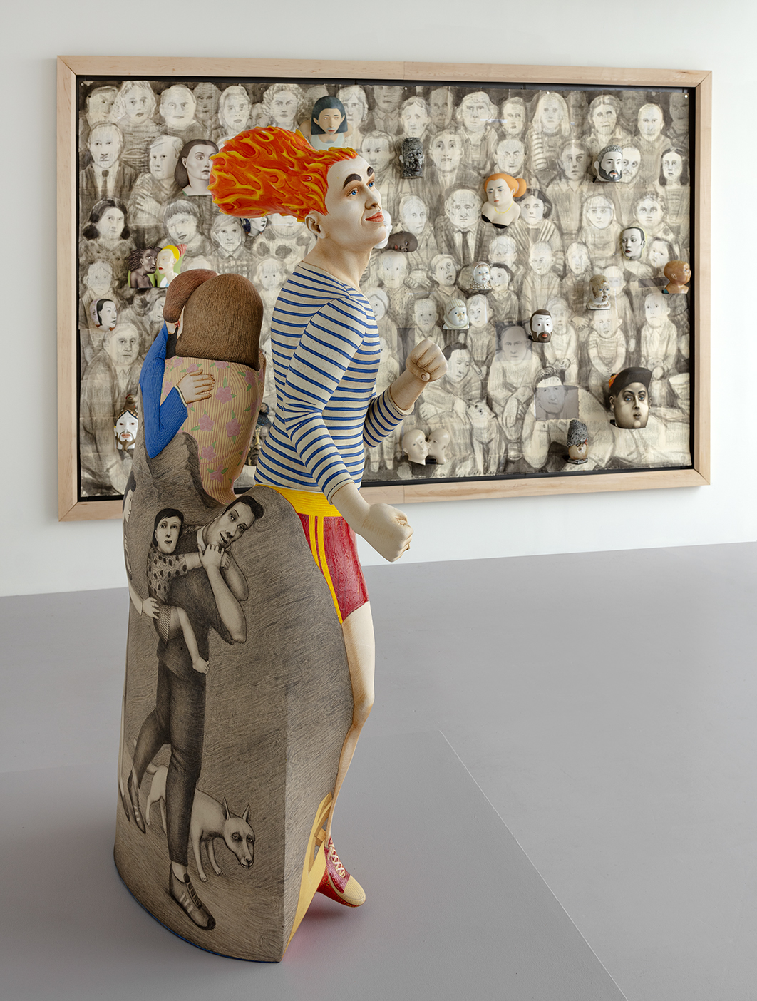 Drawing on personal experience and human observation, he creates work that integrates autobiography with fictional narratives. While the robust and racially distinct facial traits make each sculpture unique, they also make the body of work capable of conveying universal experiences. The bold colour palette, heavily tattooed faces, and textured surfaces relate these works to the aesthetics of traditional Russian art, as well as to contemporary styles of illustration.Â