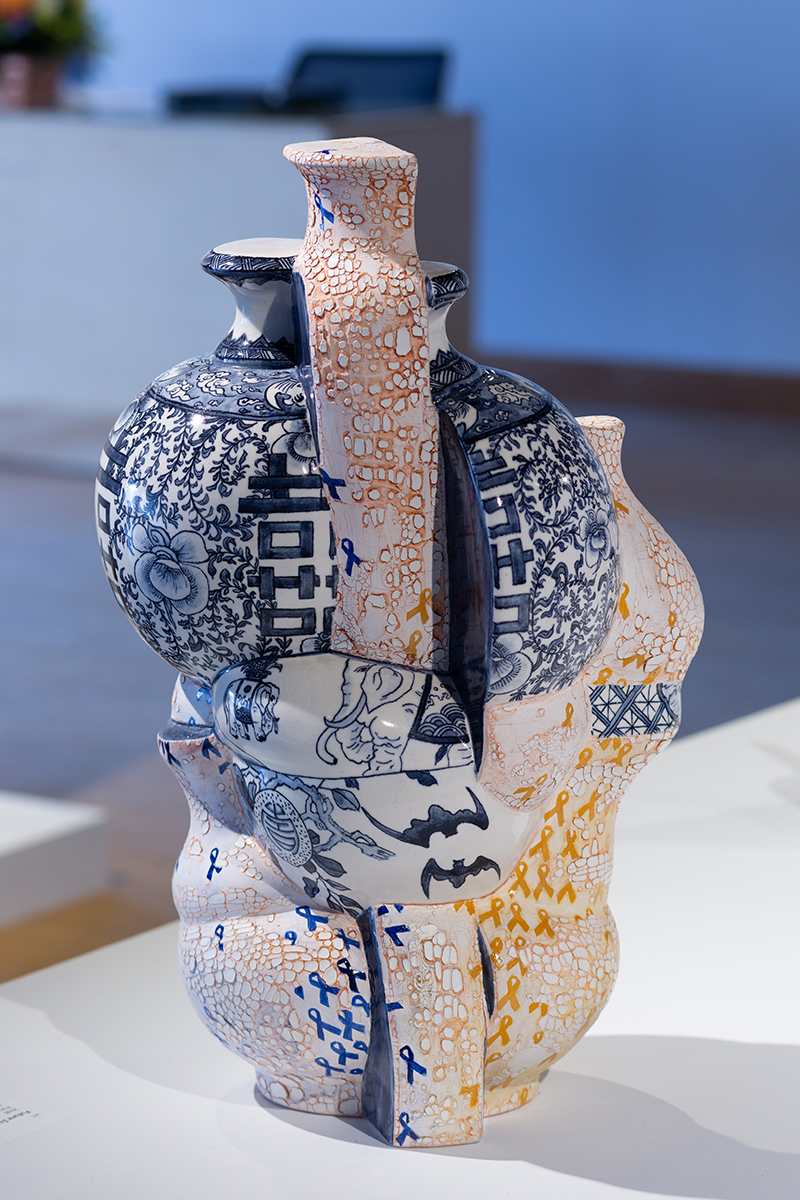 First to be presented is work by Sergei Isupov, whose sculpture titled Directions, inspired the series. A larger-than-life, authoritarian figure, the sculpture points towards a group of the artist’s smaller porcelain works which explore a range of ideas leading in new directions. Isupov, an established sculptor based in Cummington, MA, and Tallinn, Estonia, is world known for his surrealistic, figure-ground personal narratives which simultaneously integrate painted imagery and dimensional surfaces.